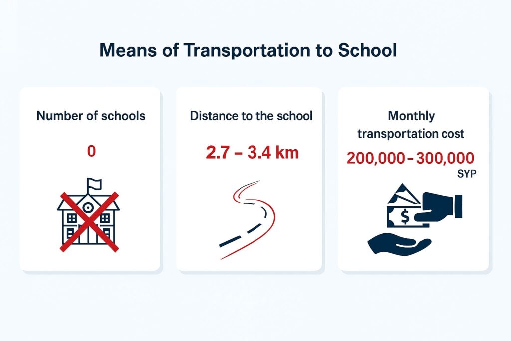 | Transportation Costs | 100,000–300,000 Syrian pounds per month, up to 400,000 | Up to 12,000 Syrian pounds per day per child |