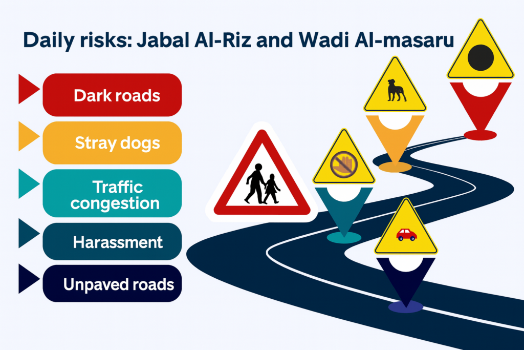 The students’ suffering does not end with the long distance; their daily journey turns into a path fraught with danger. They are forced to walk along unpaved roads, which further increase the hardship of commuting. With the onset of winter or delays in returning home, these streets are plunged into complete darkness, fueling fear—especially with the presence of stray dogs and the heightened risk of harassment. Upon reaching the main roads, they face another threat: heavy traffic congestion that endangers their physical safety.