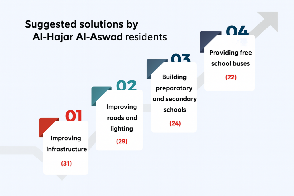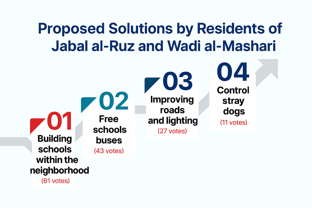 The residents’ proposals reflect a clear awareness of the root causes of the problem. The suggested solutions are divided into three main approaches: an infrastructural approach focused on building new schools; a service-based approach aimed at providing transportation and improving roads; and an organizational approach related to scheduling and integration. Below is a statistical overview illustrating the level of public support for each proposed solution: