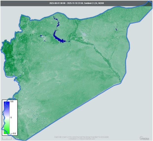 مؤشر الرطوبة الفرقية المعياري (NDWI) لرسم خرائط المسطحات المائية، من 1 آب/ أغسطس 2025 حتى 11 تشرين الثاني/ نوفمبر 2025. تكون قيم المسطحات المائية أكبر من 0.5، بينما تكون قيم الغطاء النباتي أقل. أما الملامح المبنية، فتتراوح قيمها بين صفر و0.2، تشير الخريطة إلى انخفاض الرطوبة السطحية في معظم الأراضي الزراعية خلال أواخر صيف وخريف 2025، ما يعني أن إنتاج الزيتون في هذه الفترة يعتمد بدرجة كبيرة على مصادر الري، الأمر الذي يرفع استهلاك المياه المرتبط بإنتاج زيت الزيتون. (المصدر: خرائط كوبرنيكوس)