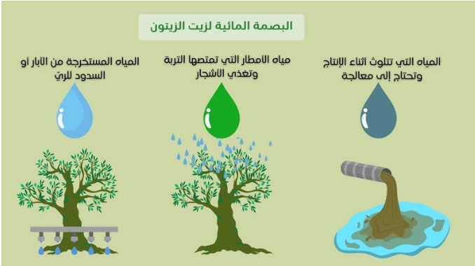 في إنتاج الزيتون، لا تقتصر المياه المستخدمة على مياه الري التي تسقي الأشجار، بل تشمل أيضاً المياه التي تصبح ضرورية لاحقاً لتخفيف التلوث الناتج عن بقايا الأسمدة أو المبيدات التي قد تتسرب إلى التربة والمياه الجوفية. هذه الكمية الإضافية تُحسب ضمن “مياه معاصر الزيتون”، وهي جزء أساسي من البصمة المائية للمحصول.