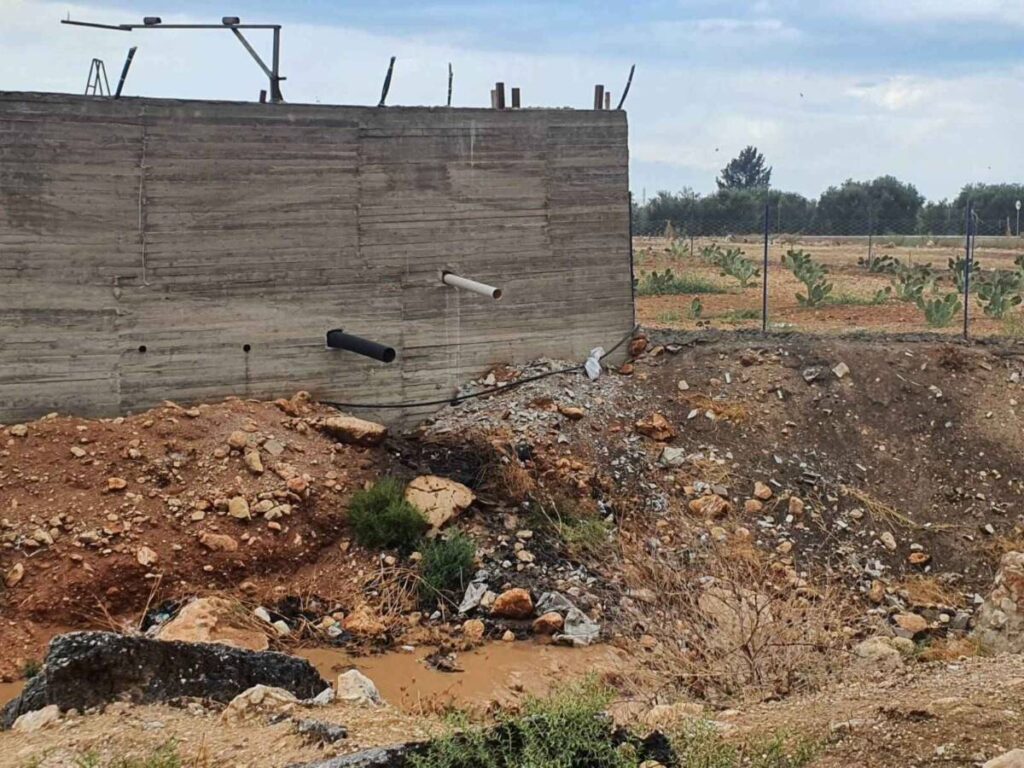 أنابيب تخترق جدار أحد معاصر زيت الزيتون في محافظة إدلب، بهدف التخلص من مخلفات المعاصر في أرض زراعية مجاورة