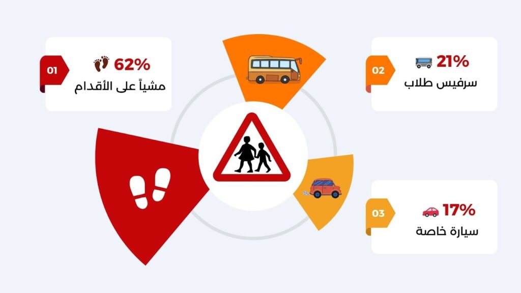 يعتمد السواد الأعظم من الطلاب على المشي كوسيلة أساسية للوصول إلى المدرسة بنسبة بلغت 62%، بينما يلجأ البقية إلى وسائل النقل المأجورة، حيث يستخدم 21% منهم “سرفيس” الطلاب، في حين تقتصر شريحة 17% على استخدام السيارات الخاصة أو سيارات الأجرة.