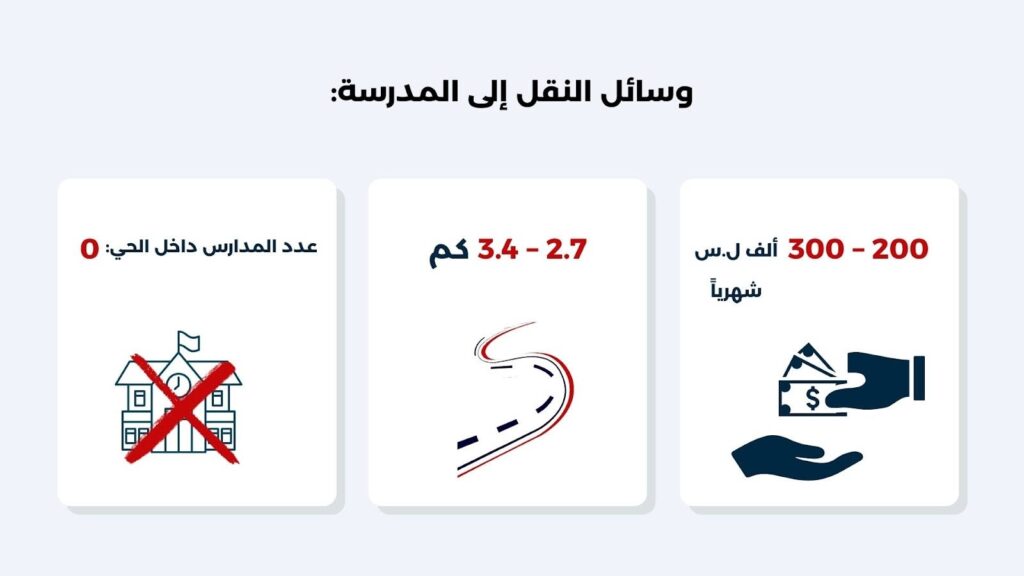 يعاني سكان الحي من غياب المدارس، مما يجبر أطفالهم على خوض رحلة يومية شاقة تمتد لمسافة تصل إلى 3.4 كيلومتر. ولا تتوقف المعاناة عند طول الطريق، بل تمتد لتستنزف جيوب الأهالي بتكاليف نقل باهظة تتراوح بين 200 و300 ألف ليرة شهرياً عن كل طفل.