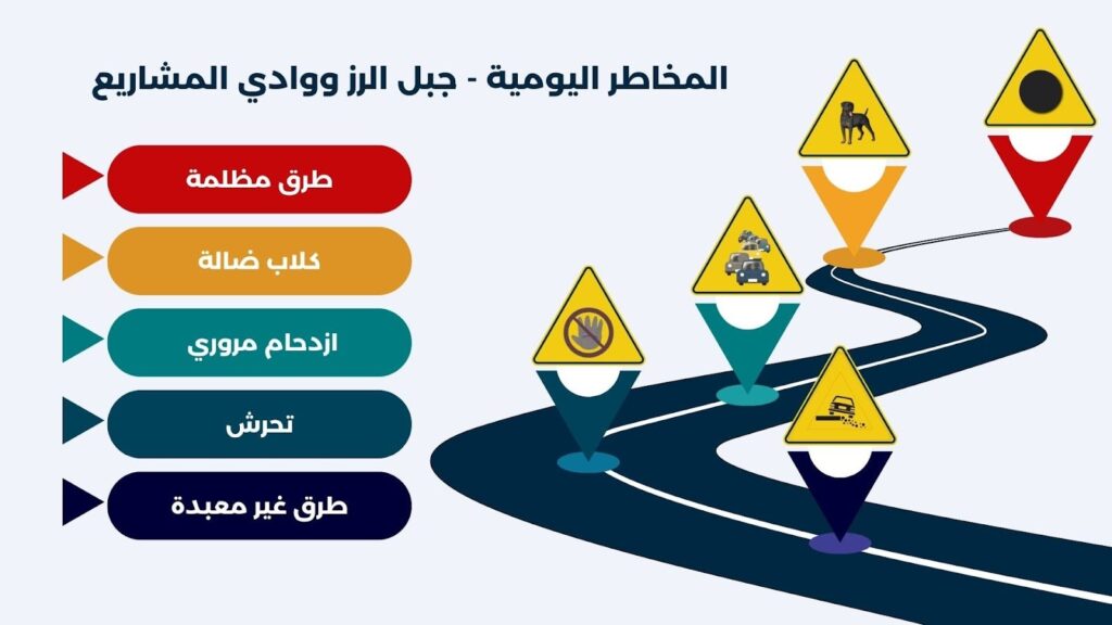 | البيئة الآمنة | طرق مظلمة، كلاب ضالة، تحرش، ازدحام، طرق غير معبدة | أنقاض، صرف صحي مكشوف، خطر الخطف والسقوط |