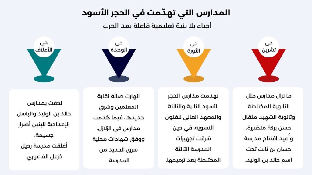 كان الحجر الأسود حياً شعبياً نابضاً بالحياة قبل الحرب، لكنه عاش بين عامي 2015 و2018 حصاراً طويلاً وقصفاً دمّر نحو 80% من البنية التحتية، بما فيها معظم المدارس.