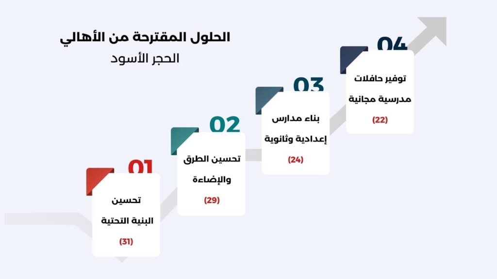 عكست مقترحات الأهالي وعياً واضحاً بجذور المشكلة؛ حيث انقسمت الحلول المطروحة إلى ثلاثة مسارات رئيسية: مسار إنشائي لبناء مدارس جديدة، مسار خدمي لتأمين النقل وتحسين الطرق، ومسار تنظيمي يتعلق بالتوقيت والدمج. وفيما يلي بيان إحصائي يوضح حجم التأييد الشعبي لكل مقترح: